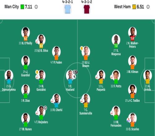 曼城首发:25-多纳鲁马、3-鲁本-迪亚斯、24-格瓦迪奥尔、27-努内斯、33-奥赖利、14-尼科·冈萨雷斯(67’82-刘易斯)、20-B席(75’63-穆卡萨)、4-赖因德斯(67’26-萨维尼奥)、47-福登、10-谢尔基(67’45-胡桑诺夫)、9-哈兰德。