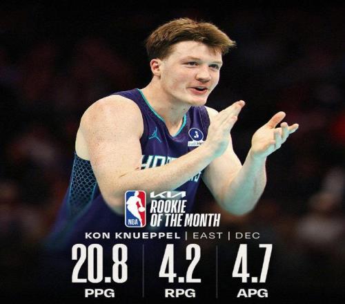 NBA官方还公布了2025-26赛季12月的月最佳新秀,达拉斯独行侠的库珀-弗拉格与夏洛特黄蜂的康-克努佩尔分别当选。